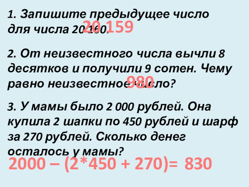3. У мамы было 2 000 рублей. Она купила 2 шапки по 450 рублей и шарф за 270 рублей. Сколько денег осталось у мамы?