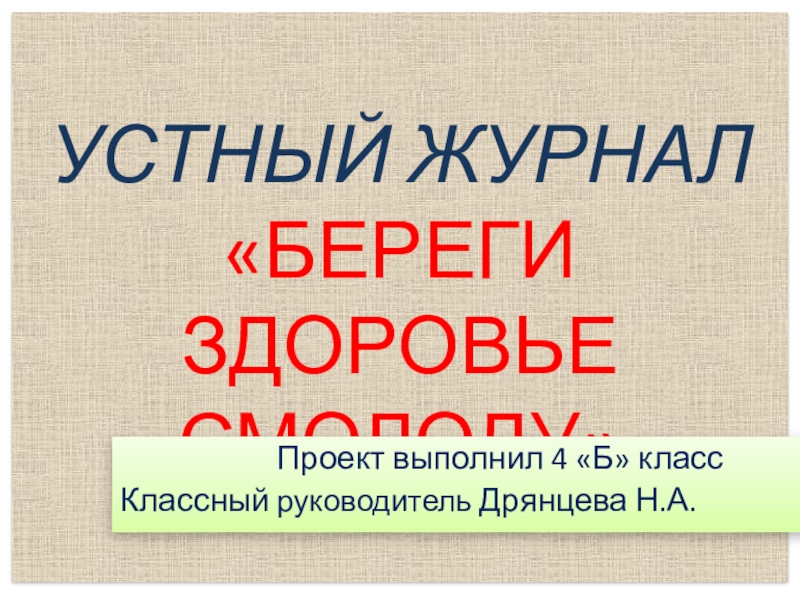 УСТНЫЙ ЖУРНАЛ «БЕРЕГИ ЗДОРОВЬЕ СМОЛОДУ»Проект выполнил 4 «Б» классКлассный руководитель Дрянцева Н.А.