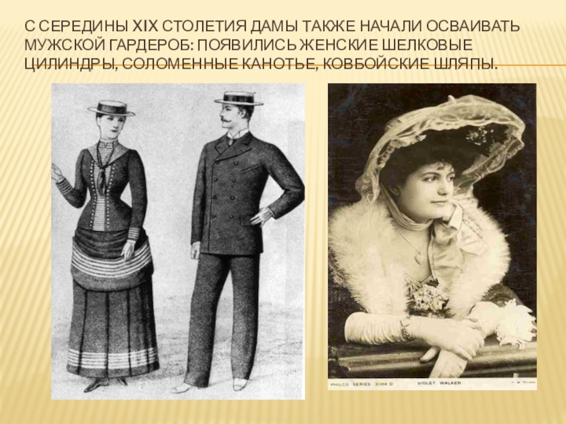 С середины XIX столетия дамы также начали осваивать мужской гардероб: появились женские шелковые цилиндры, соломенные канотье, ковбойские