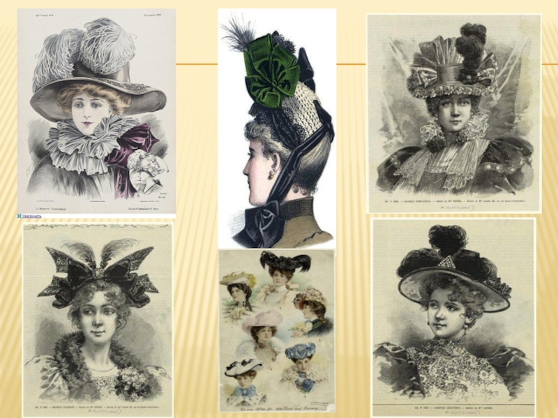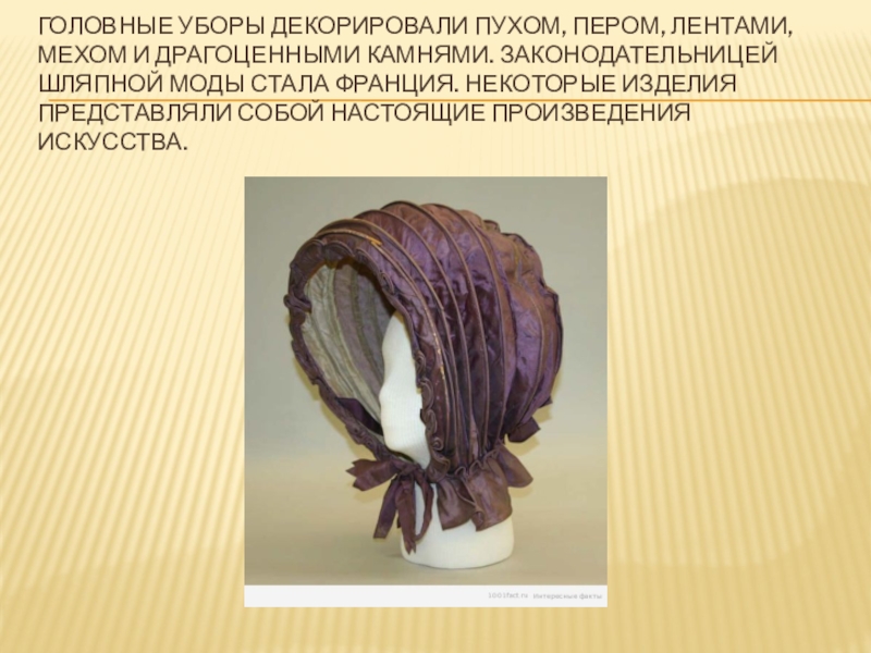 Головные уборы декорировали пухом, пером, лентами, мехом и драгоценными камнями. Законодательницей шляпной моды стала Франция. Некоторые изделия