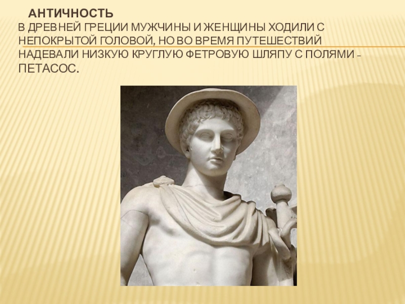 Античность В Древней Греции мужчины и женщины ходили с непокрытой головой, но во время путешествий надевали