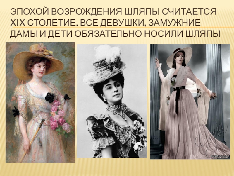 Слайд 18Эпохой возрождения шляпы считается XIX столетие. Все девушки, замужние дамы и