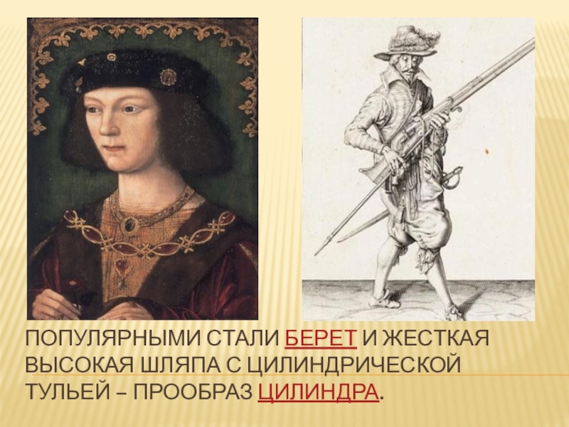 Слайд 6Популярными стали берет и жесткая высокая шляпа с цилиндрической тульей – прообраз цилиндра.