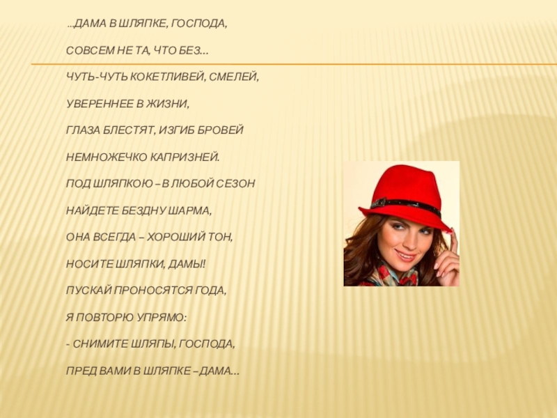 Слайд 35 …дама в шляпке, господа,    Совсем не та, что без…    Чуть-чуть кокетливей, смелей,    Увереннее в