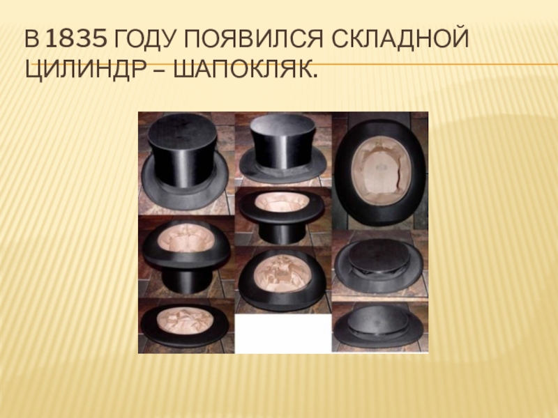 Слайд 13В 1835 году появился складной цилиндр – шапокляк.