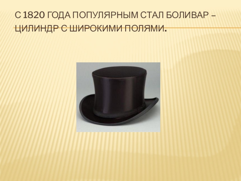 Слайд 12С 1820 года популярным стал боливар – цилиндр с широкими полями.