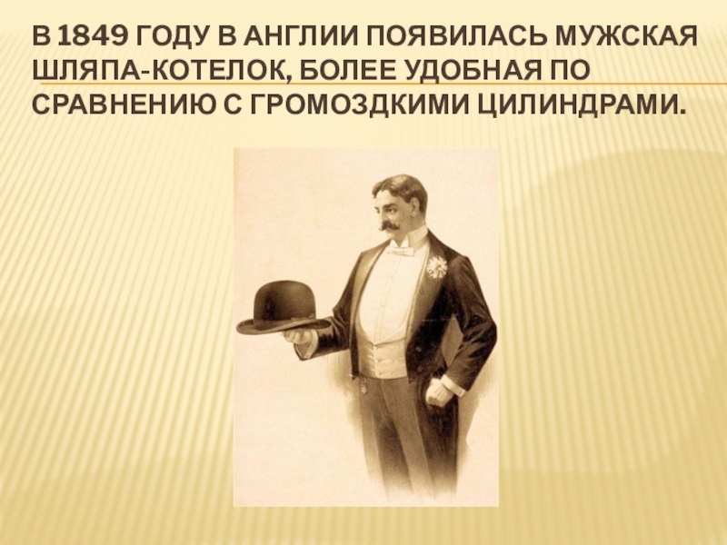 Слайд 14В 1849 году в Англии появилась мужская шляпа-котелок, более удобная по
