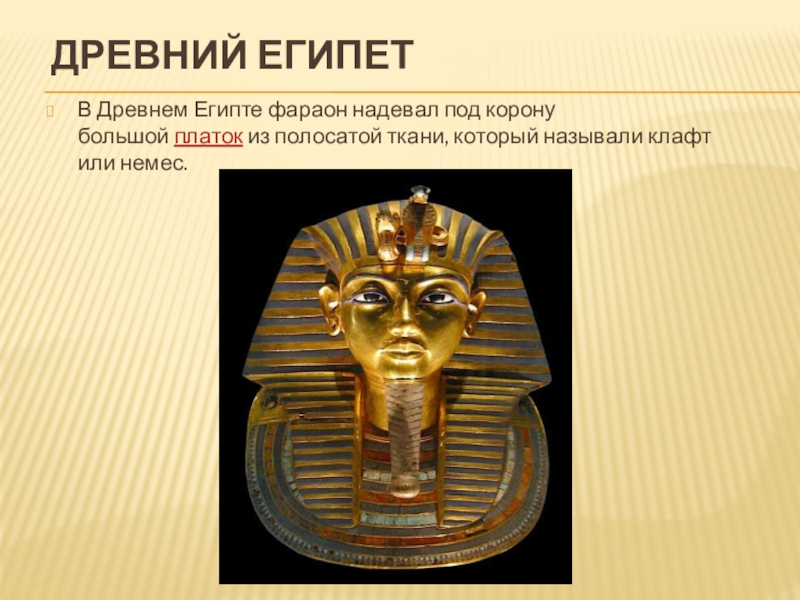 Древний Египет В Древнем Египте фараон надевал под корону большой платок из полосатой ткани, который называли клафт или немес.