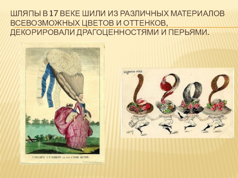 Слайд 7Шляпы в 17 веке шили из различных материалов всевозможных цветов и