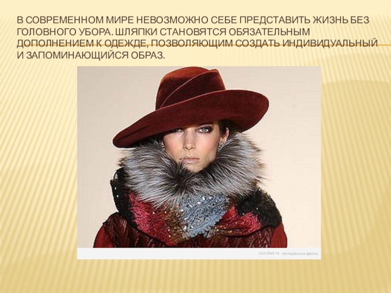 Слайд 29В современном мире невозможно себе представить жизнь без головного убора. Шляпки