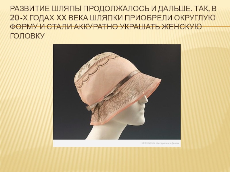 Слайд 26Развитие шляпы продолжалось и дальше. Так, в 20-х годах XX века