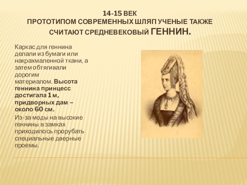 14-15 век Прототипом современных шляп ученые также считают средневековый геннин.Каркас для геннина делали из бумаги или накрахмаленной