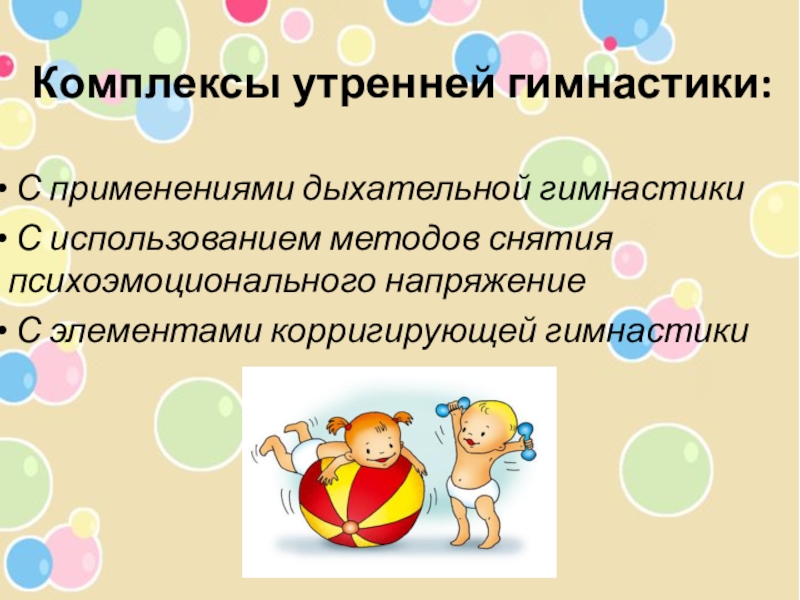 Комплексы утренней гимнастики: С применениями дыхательной гимнастики С использованием методов снятия психоэмоционального напряжение С элементами