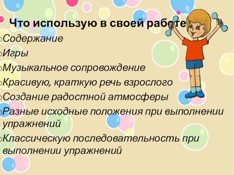 Что использую в своей работе:СодержаниеИгрыМузыкальное сопровождениеКрасивую, краткую речь взрослогоСоздание радостной атмосферыРазные исходные положения при выполнении