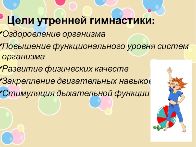 Цели утренней гимнастики:Оздоровление организмаПовышение функционального уровня систем организмаРазвитие физических качествЗакрепление двигательных навыковСтимуляция дыхательной функции