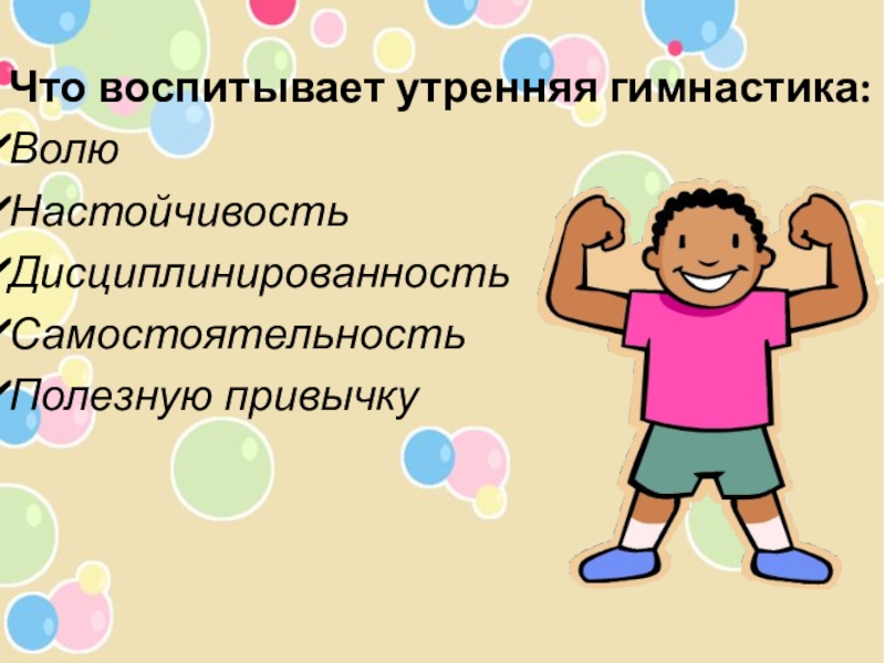 Что воспитывает утренняя гимнастика:ВолюНастойчивостьДисциплинированностьСамостоятельностьПолезную привычку