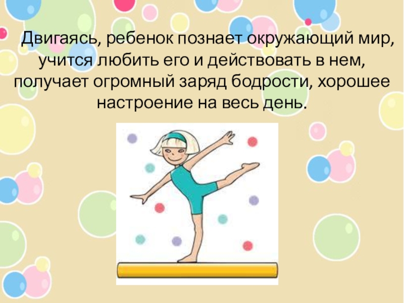 Двигаясь, ребенок познает окружающий мир, учится любить его и действовать в нем, получает огромный заряд