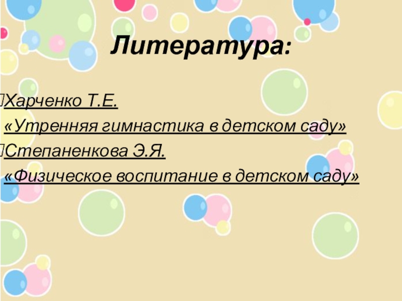Литература:Харченко Т.Е.«Утренняя гимнастика в детском саду»Степаненкова Э.Я.«Физическое воспитание в детском саду»