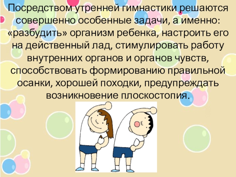 Слайд 3Посредством утренней гимнастики решаются совершенно особенные задачи, а именно: «разбудить» организм