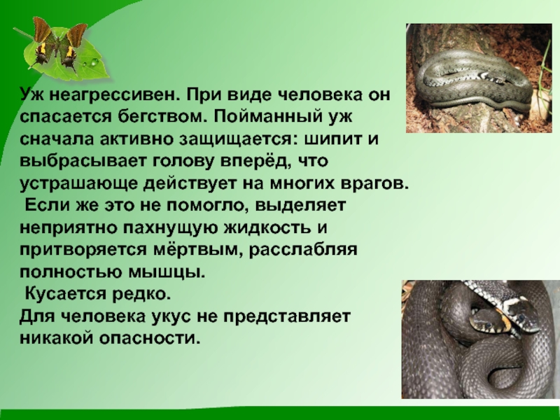 Слайд 6Уж неагрессивен. При виде человека он спасается бегством. Пойманный уж сначала