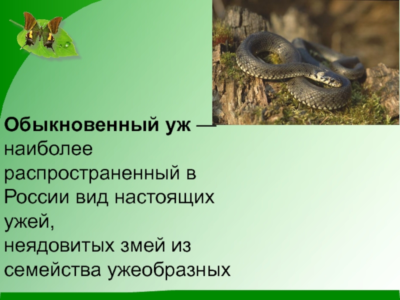 Слайд 2Обыкновенный уж — наиболее распространенный в России вид настоящих ужей, неядовитых змей из семейства ужеобразных
