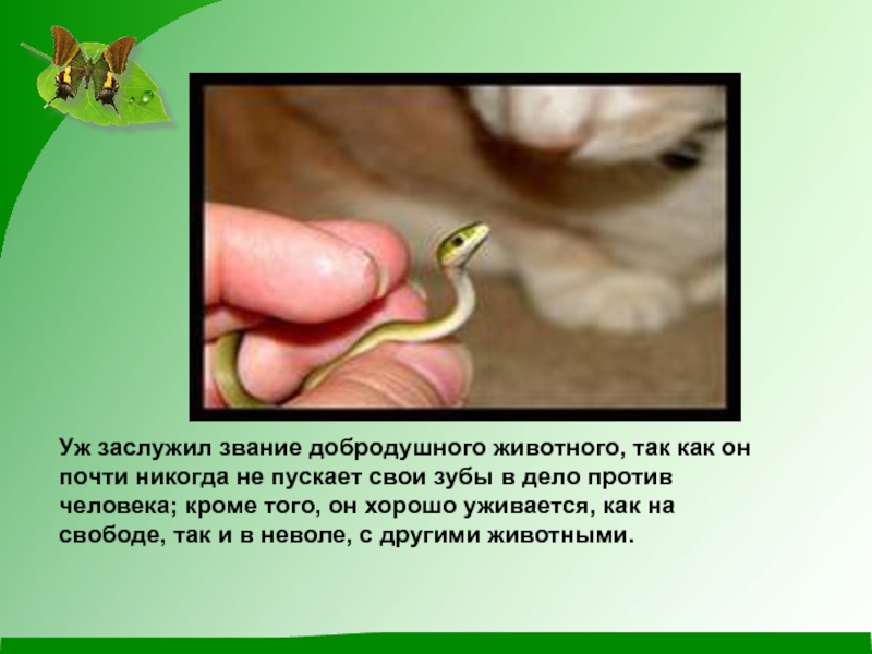 Слайд 10Уж заслужил звание добродушного животного, так как он почти никогда не