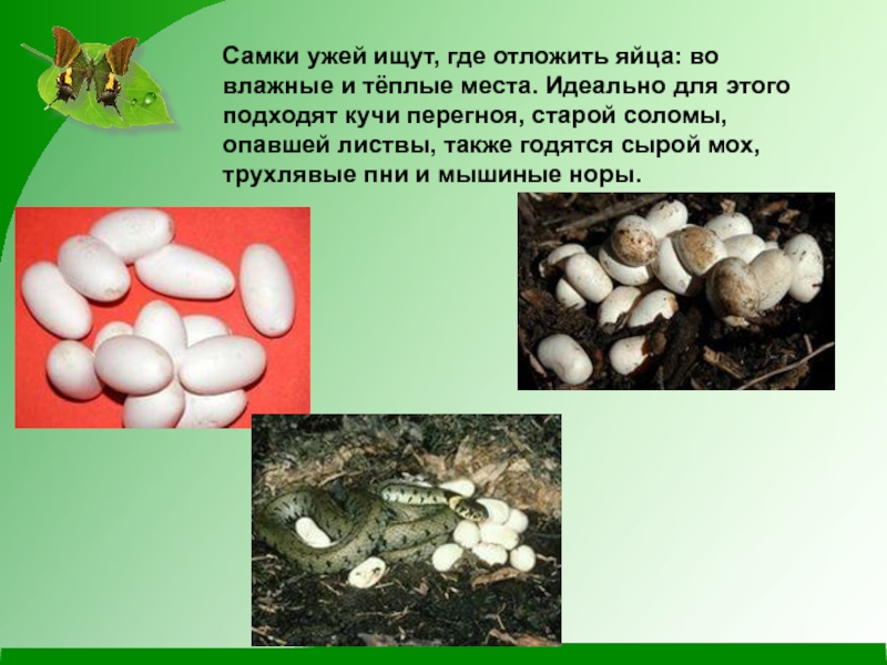 Слайд 8Самки ужей ищут, где отложить яйца: во влажные и тёплые места.