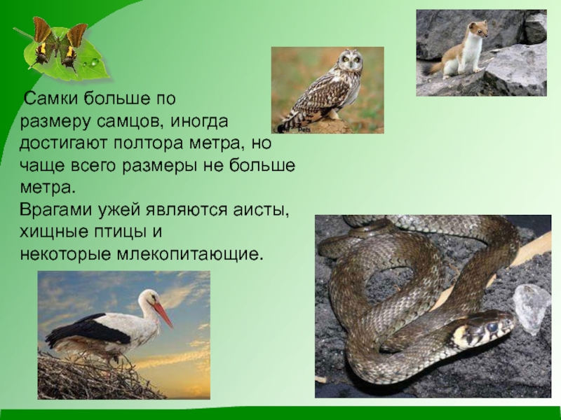 Самки больше по размеру самцов, иногда достигают полтора метра, но чаще всего размеры не больше метра. Врагами ужей являются аисты,