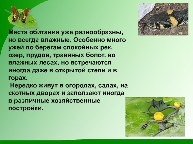 Слайд 5Места обитания ужа разнообразны, но всегда влажные. Особенно много ужей по