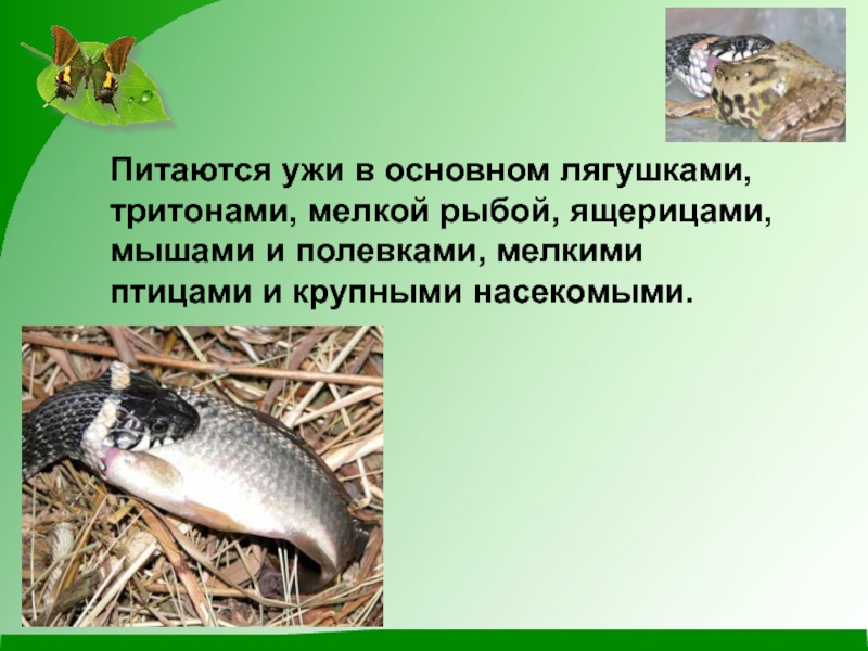 Слайд 7Питаются ужи в основном лягушками, тритонами, мелкой рыбой, ящерицами, мышами и