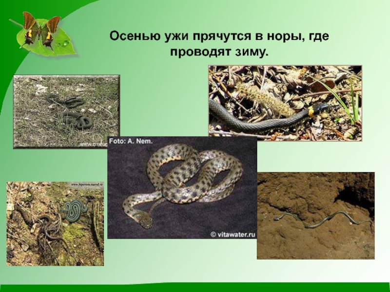 Слайд 9Осенью ужи прячутся в норы, где проводят зиму.