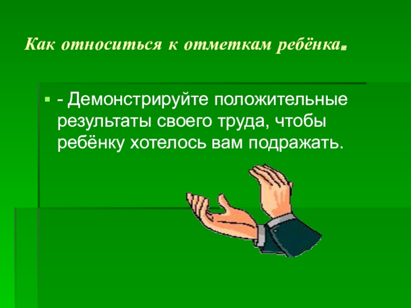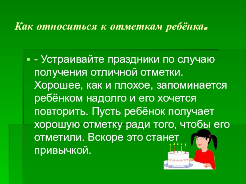 отметки. Хорошее, как и плохое, запоминается ребёнком надолго и его хочется повторить. Пусть ребёнок получает хорошую отметку ради того, чтобы его отметили. Вскоре это станет привычкой.