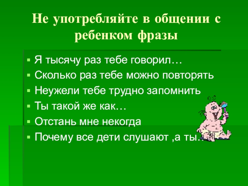 Слайд 6Не употребляйте в общении с ребенком фразы