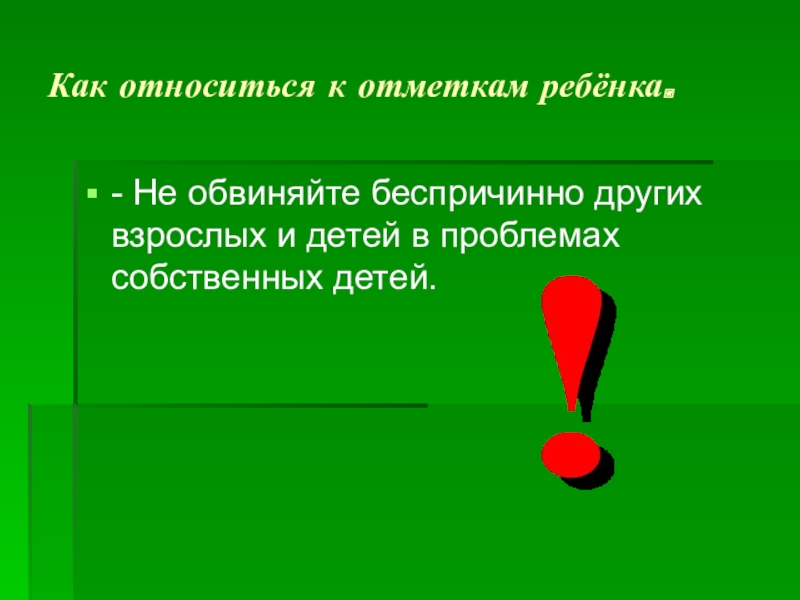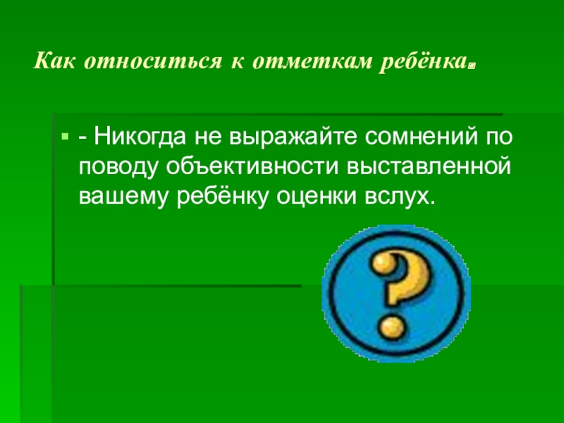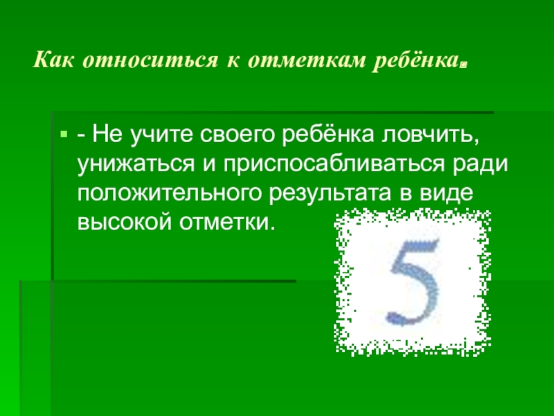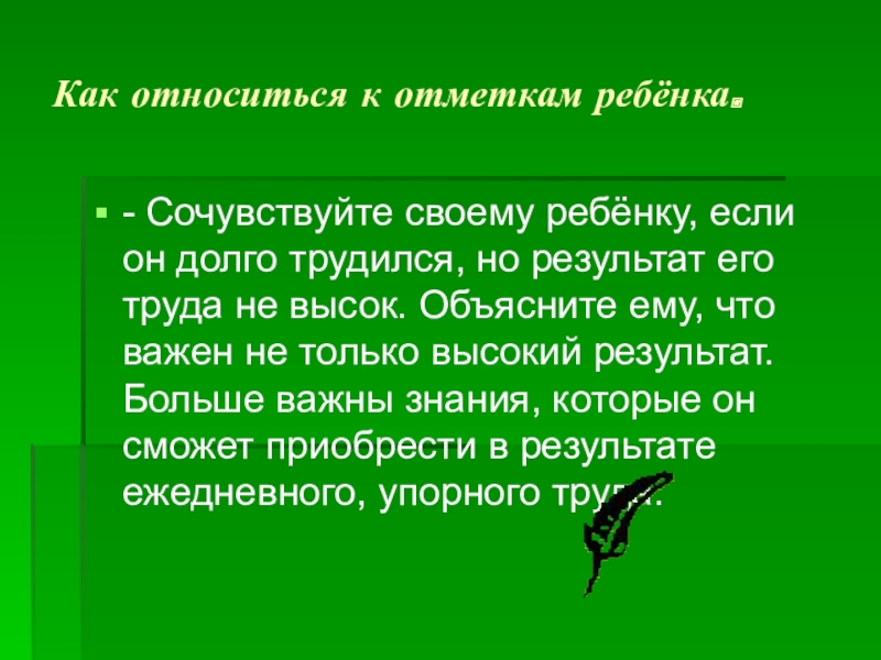Ежедневно интересуйтесь учебными успехами ребенка (спрашивайте: «Что ты сегодня узнал нового?» вместо традиционного «Какую сегодня получил оценку?»). Радуйтесь успехам, не раздражайтесь из-за каждой неудачи, постигшей ребенка.