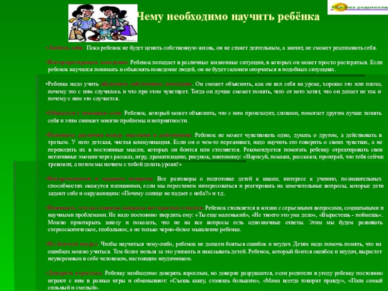Думать самому. Чувство собственной уникальности и способности к выбору - жизненно важная часть человеческого существования. Этой способности легко научить, если просто поощрять ребенка в том, чтобы он высказывал свое суждение, не боясь, что его накажут или будут над ним смеяться.