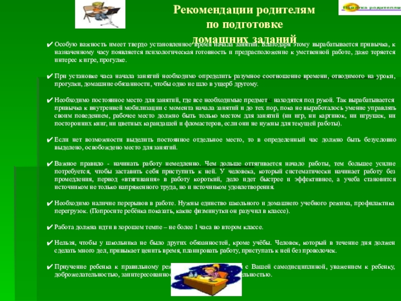 Лучшее время для домашних занятий с ребенком с 15 до 17 часов - первая смена, с 9 до 11 часов – вторая смена. Занятия вечерами бесполезны, т.к. ребенок уже устал от насыщенного учебного дня.