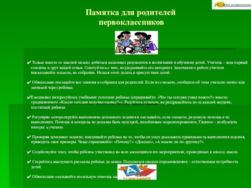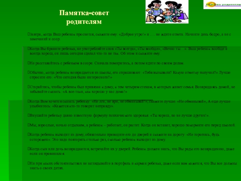 результатов в воспитании и обучении детей. Учитель – ваш первый союзник и друг вашей семьи. Советуйтесь с ним, поддерживайте его авторитет. Замечания о работе учителя высказывайте в школе, на собрании. Нельзя этого делать в присутствии детей.
