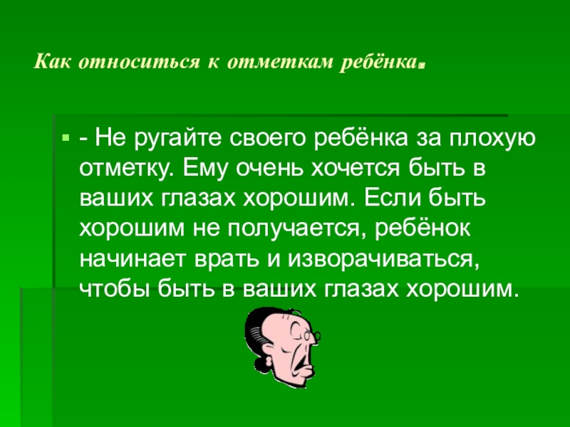 отметку. Ему очень хочется быть в ваших глазах хорошим. Если быть хорошим не получается, ребёнок начинает врать и изворачиваться, чтобы быть в ваших глазах хорошим.