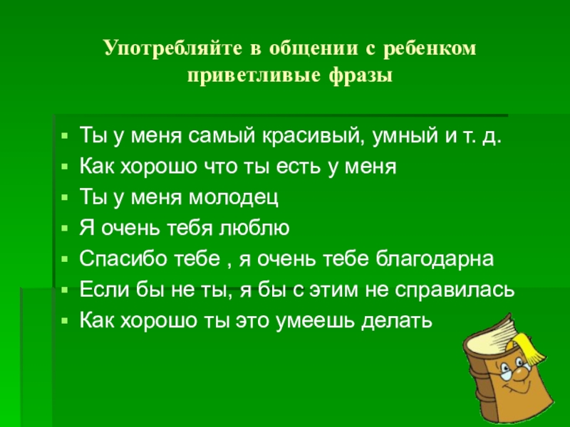 Слайд 5Употребляйте в общении с ребенком приветливые фразы