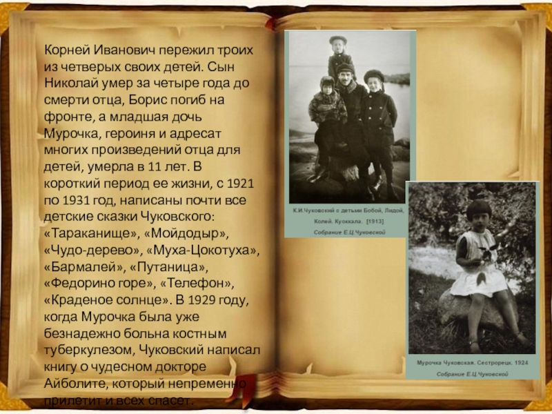 за четыре года до смерти отца, Борис погиб на фронте, а младшая дочь Мурочка, героиня и адресат многих произведений отца для детей, умерла в 11 лет. В короткий период ее жизни, с 1921 по 1931 год, написаны почти все детские сказки Чуковского: «Тараканище», «Мойдодыр», «Чудо-дерево», «Муха-Цокотуха», «Бармалей», «Путаница», «Федорино горе», «Телефон», «Краденое солнце». В 1929 году, когда Мурочка была уже безнадежно больна костным туберкулезом, Чуковский написал книгу о чудесном докторе Айболите, который непременно прилетит и всех спасет.