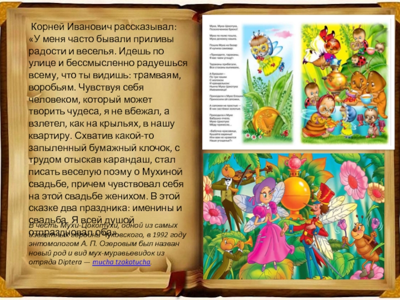 веселья. Идешь по улице и бессмысленно радуешься всему, что ты видишь: трамваям, воробьям. Чувствуя себя человеком, который может творить чудеса, я не вбежал, а взлетел, как на крыльях, в нашу квартиру. Схватив какой-то запыленный бумажный клочок, с трудом отыскав карандаш, стал писать веселую поэму о Мухиной свадьбе, причем чувствовал себя на этой свадьбе женихом. В этой сказке два праздника: именины и свадьба. Я всей душой отпраздновал оба».