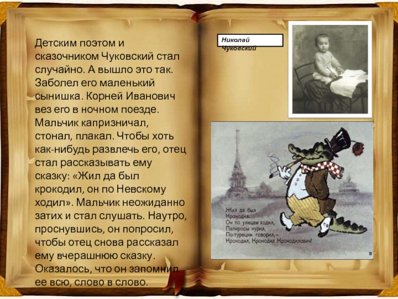 Заболел его маленький сынишка. Корней Иванович вез его в ночном поезде. Мальчик капризничал, стонал, плакал. Чтобы хоть как-нибудь развлечь его, отец стал рассказывать ему сказку: «Жил да был крокодил, он по Невскому ходил». Мальчик неожиданно затих и стал слушать. Наутро, проснувшись, он попросил, чтобы отец снова рассказал ему вчерашнюю сказку. Оказалось, что он запомнил ее всю, слово в слово.