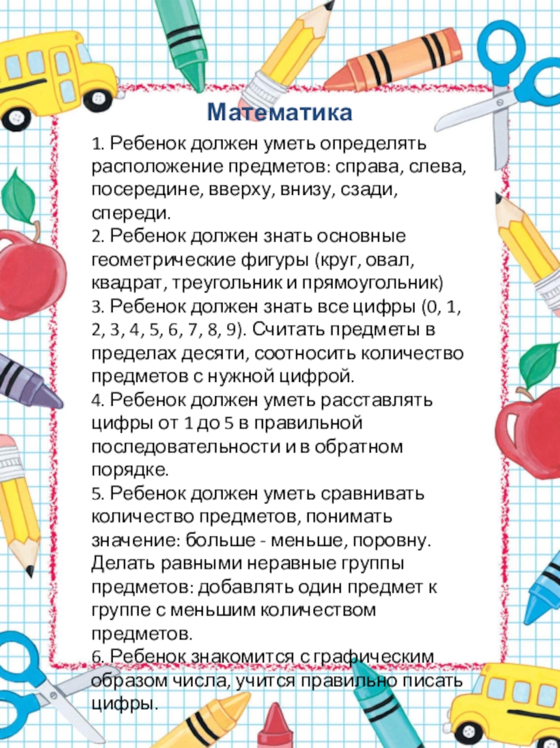 1. Ребенок должен уметь определять расположение предметов: справа, слева, посередине, вверху,