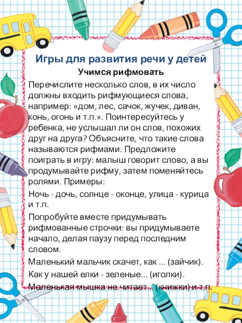 число должны входить рифмующиеся слова, например: «дом, лес, сачок, жучек, диван, конь, огонь и т.п.». Поинтересуйтесь у ребенка, не услышал ли он слов, похожих друг на друга? Объясните, что такие слова называются рифмами. Предложите поиграть в игру: малыш говорит слово, а вы продумывайте рифму, затем поменяйтесь ролями. Примеры: