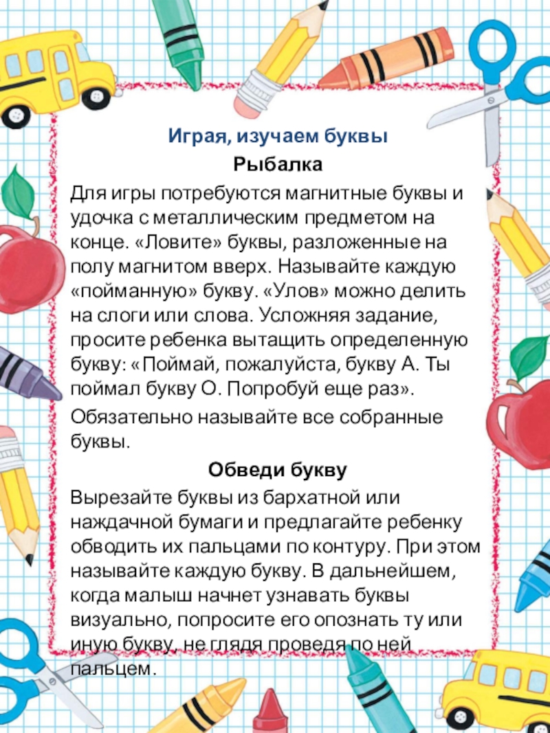предметом на конце. «Ловите» буквы, разложенные на полу магнитом вверх. Называйте каждую «пойманную» букву. «Улов» можно делить на слоги или слова. Усложняя задание, просите ребенка вытащить определенную букву: «Поймай, пожалуйста, букву А. Ты поймал букву О. Попробуй еще раз».