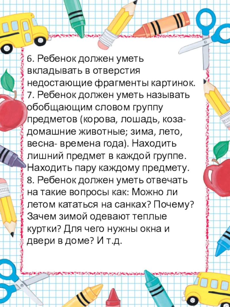 должен уметь называть обобщающим словом группу предметов (корова, лошадь, коза-домашние животные; зима, лето, весна- времена года). Находить лишний предмет в каждой группе. Находить пару каждому предмету.