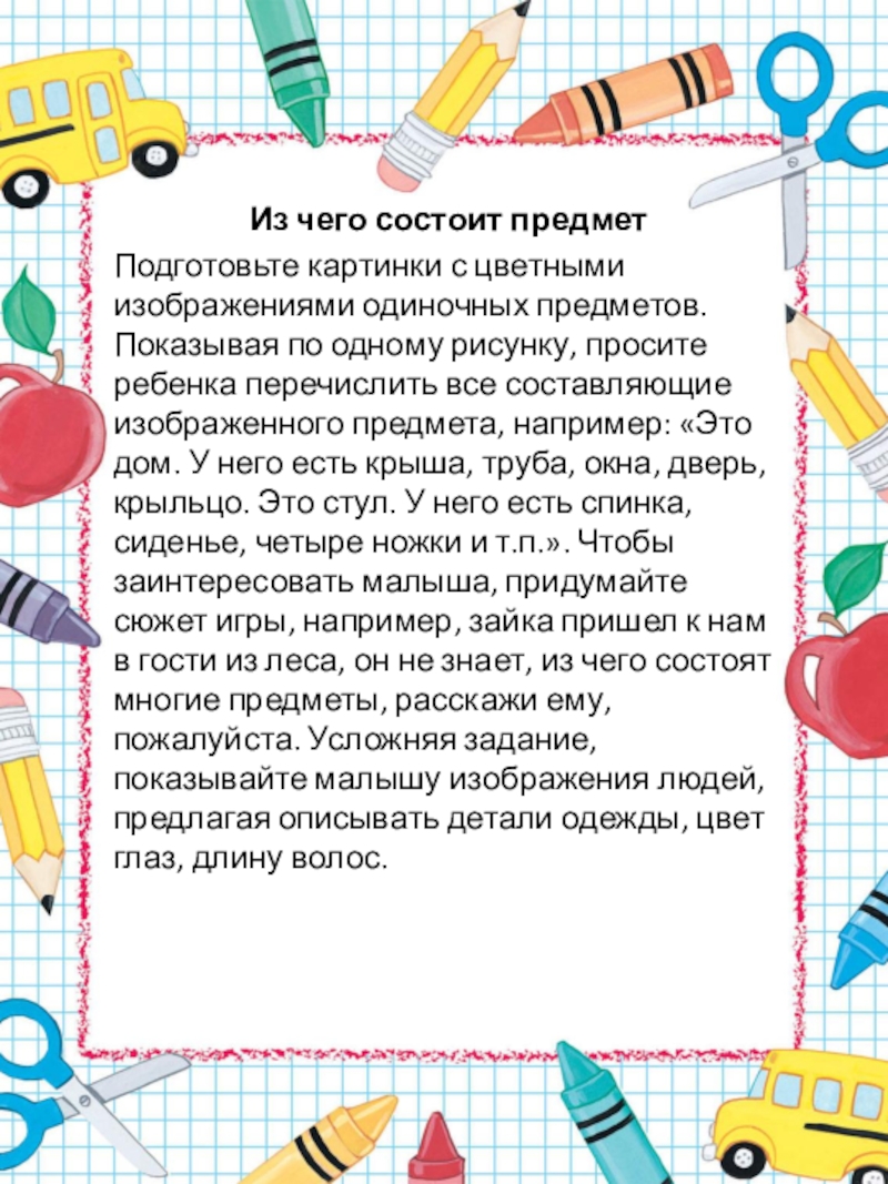 по одному рисунку, просите ребенка перечислить все составляющие изображенного предмета, например: «Это дом. У него есть крыша, труба, окна, дверь, крыльцо. Это стул. У него есть спинка, сиденье, четыре ножки и т.п.». Чтобы заинтересовать малыша, придумайте сюжет игры, например, зайка пришел к нам в гости из леса, он не знает, из чего состоят многие предметы, расскажи ему, пожалуйста. Усложняя задание, показывайте малышу изображения людей, предлагая описывать детали одежды, цвет глаз, длину волос.