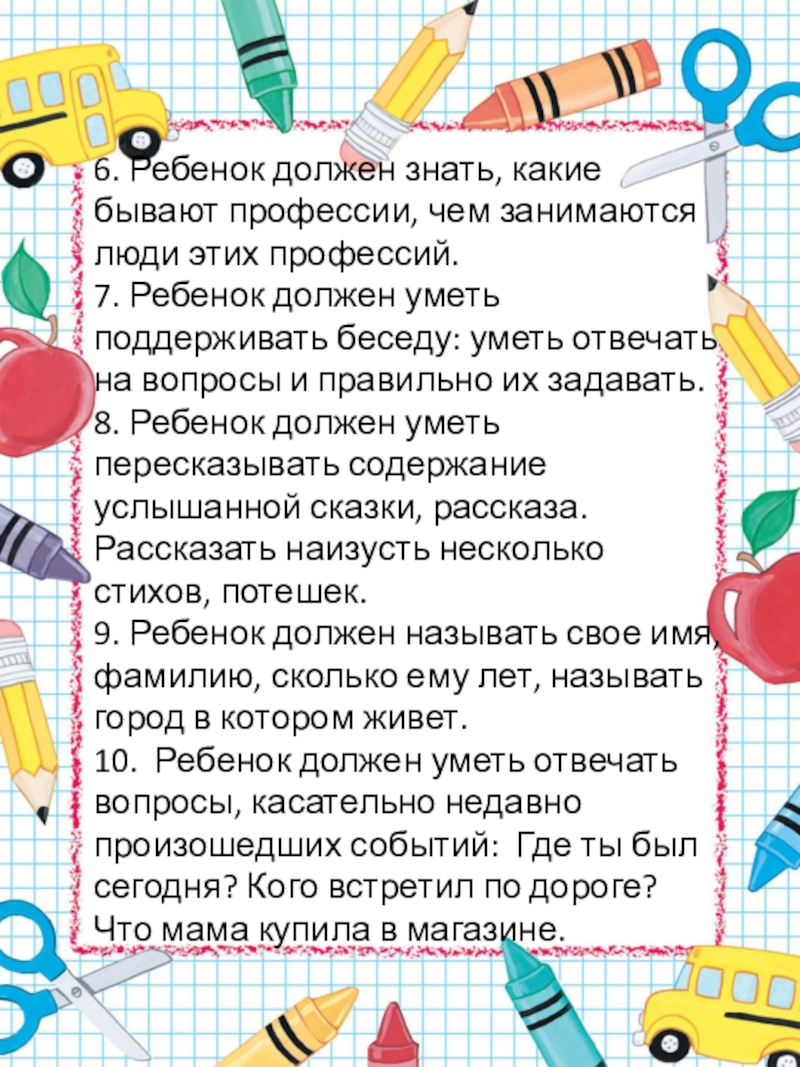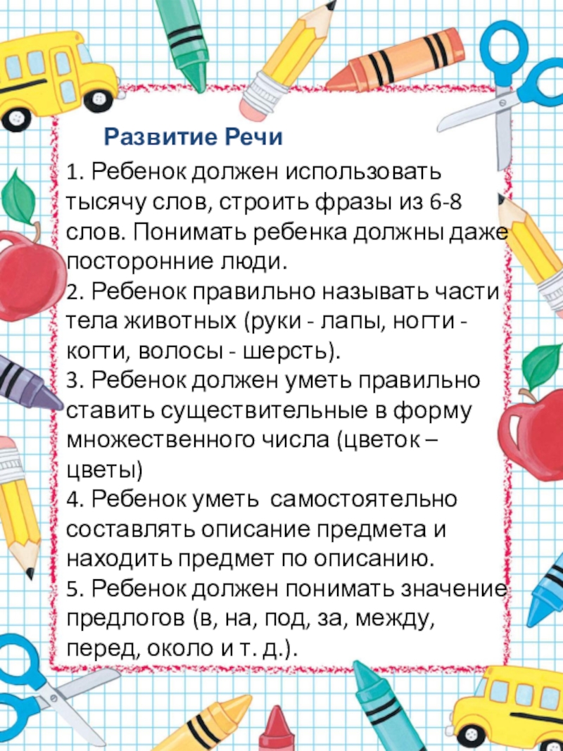 1. Ребенок должен использовать тысячу слов, строить фразы из 6-8