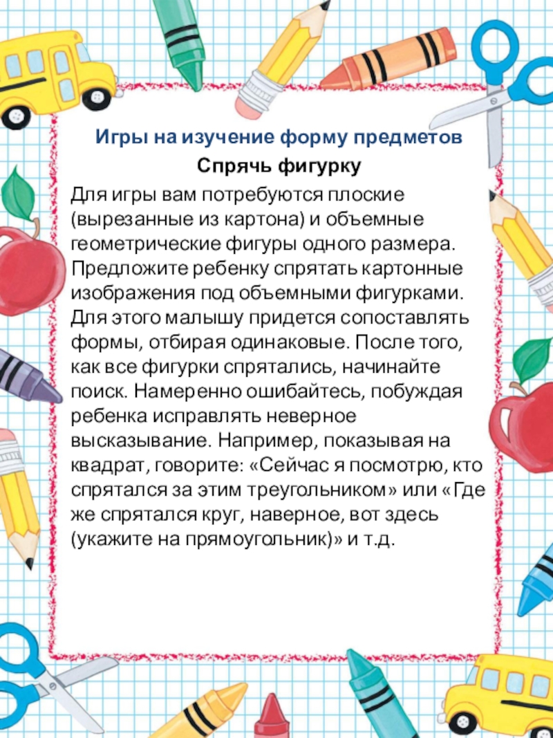 из картона) и объемные геометрические фигуры одного размера. Предложите ребенку спрятать картонные изображения под объемными фигурками. Для этого малышу придется сопоставлять формы, отбирая одинаковые. После того, как все фигурки спрятались, начинайте поиск. Намеренно ошибайтесь, побуждая ребенка исправлять неверное высказывание. Например, показывая на квадрат, говорите: «Сейчас я посмотрю, кто спрятался за этим треугольником» или «Где же спрятался круг, наверное, вот здесь (укажите на прямоугольник)» и т.д.