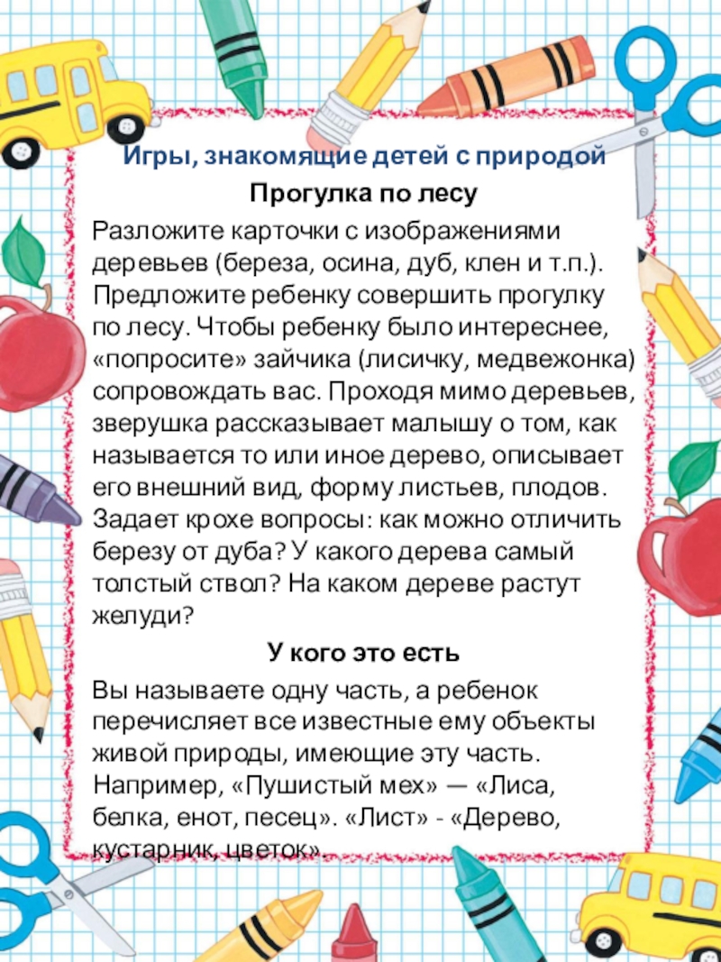 Вы называете одну часть, а ребенок перечисляет все известные ему объекты живой природы, имеющие эту часть. Например, «Пушистый мех» — «Лиса, белка, енот, песец». «Лист» - «Дерево, кустарник, цветок».